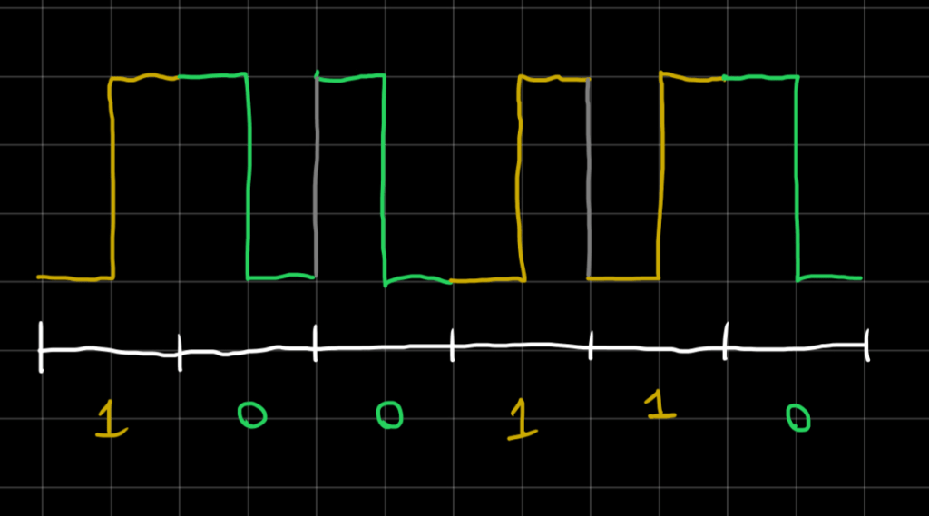 Even if I didn’t write the tick marks, you would be able to read the speed based on the signal. The only transitions that occur, occur on two time intervals: 1 grid or 2 grids. 2 grids has to be the clock speed, because it is the only speed that can lead to a sensible signal. I was confused by this at first, because it looks like the gray lines of transition could be confused as symbols since they are also transitions. So why can’t the clock speed of this signal be 1? If the gray lines were actually signals, the transitions between 1 and 0 would make no sense. They are neither 1 nor 0, since they are not changing state. Test if that makes sense by reading the binary signal and clock speed (grid spacing per signal) of a drawing with no markers or hints. If you know the signal uses Manchester encoding so that “Low to High” = 1 and “High to Low” = 0, then there is only one answer.