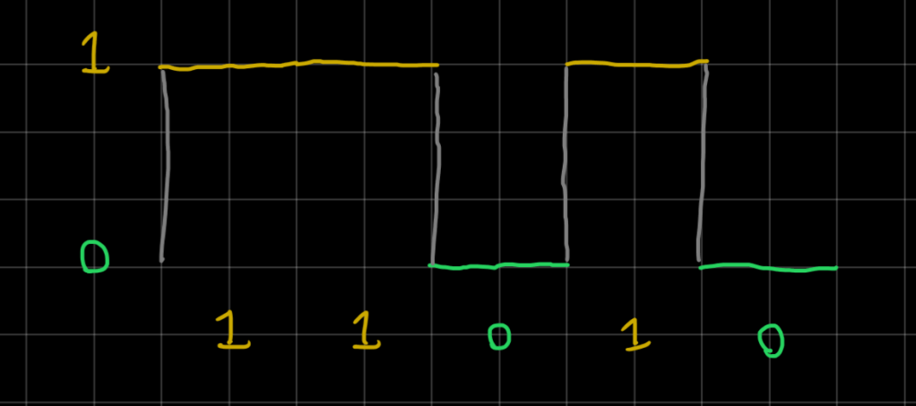Now we have a very different message (1111001100). In this image, one space on the grid corresponds to each 1 and 0. Each of these grid marks would represent some space in time, and we have to define how long each symbol will last. There are a few ways of doing this, but in some cases, even that is not enough. Even if both the sender and receiver agree on a time interval (clock speed), you could have a situation where the clocks are out of sync. Even small differences and fluctuations can blow your entire signal to nonsense.